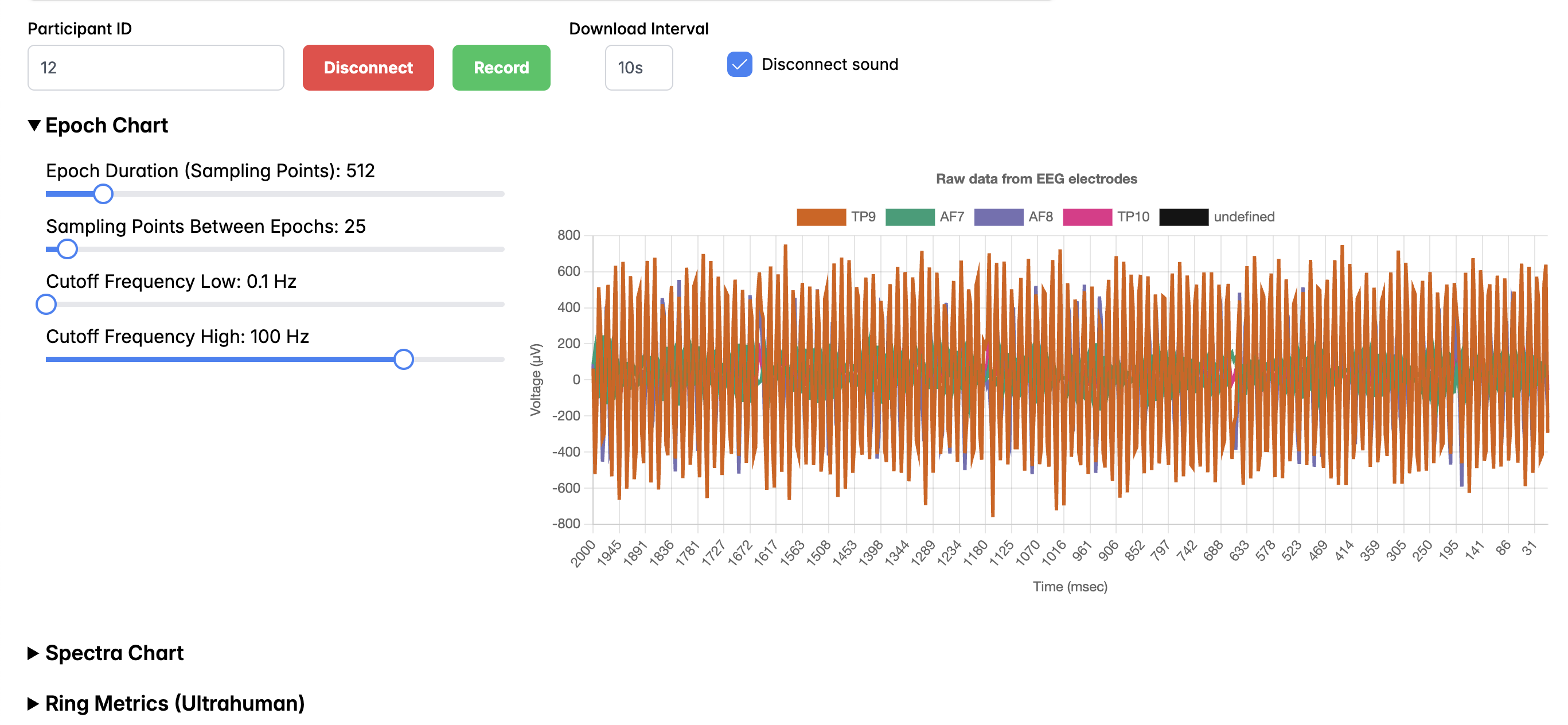 I built a web-based React app that uses the muse-js library to visualize EEG and PPG data and record them to a CSV. I also wrote a script for Qualtrics that kept track of how the user interacted with the survey, so that we could see what the EEG data looks like when, for example, the user was answering a question about loneliness.